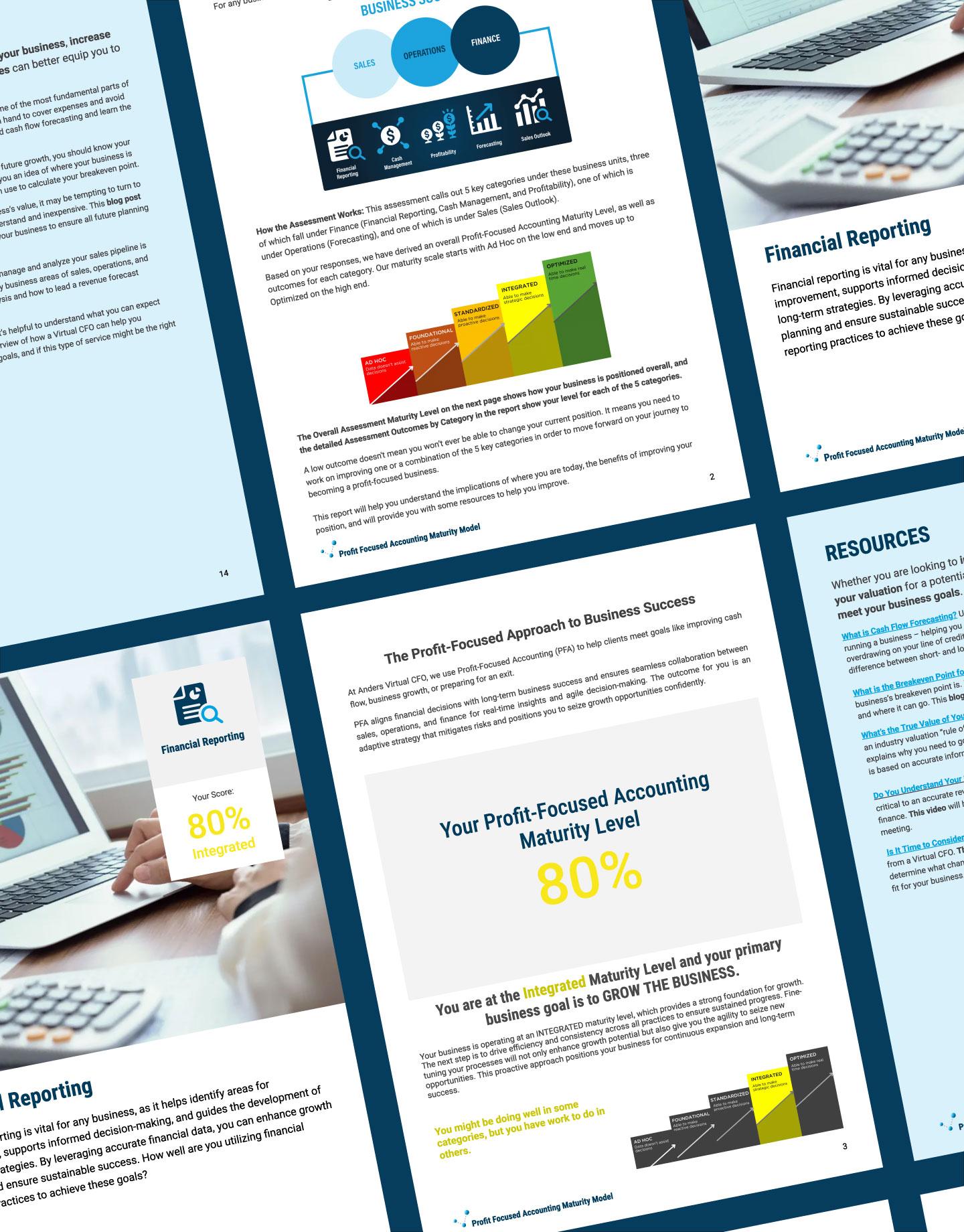 You'll get a 15-page custom report via email that calculates your maturity across the five areas of profit-focused accounting: cash management, profitability, cash flow forecasting, sales outlook and financial reporting. Taking into account your stated goal, your results will suggest areas of optimization that will have the biggest impact. From there, you can schedule a free strategy session to review your results with a virtual CFO partner that starts with your goals and leads to a plan for our collaboration.